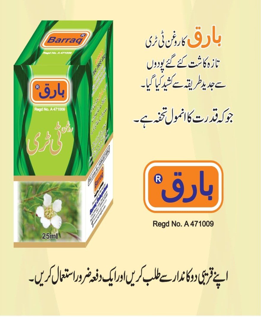 Baraq Rogan Tea Tree Oil is a 100% pure and natural essential oil extracted from premium tea tree leaves. Known for its antibacterial, antifungal, and deep-cleansing properties, it helps maintain clear skin and a healthy scalp.